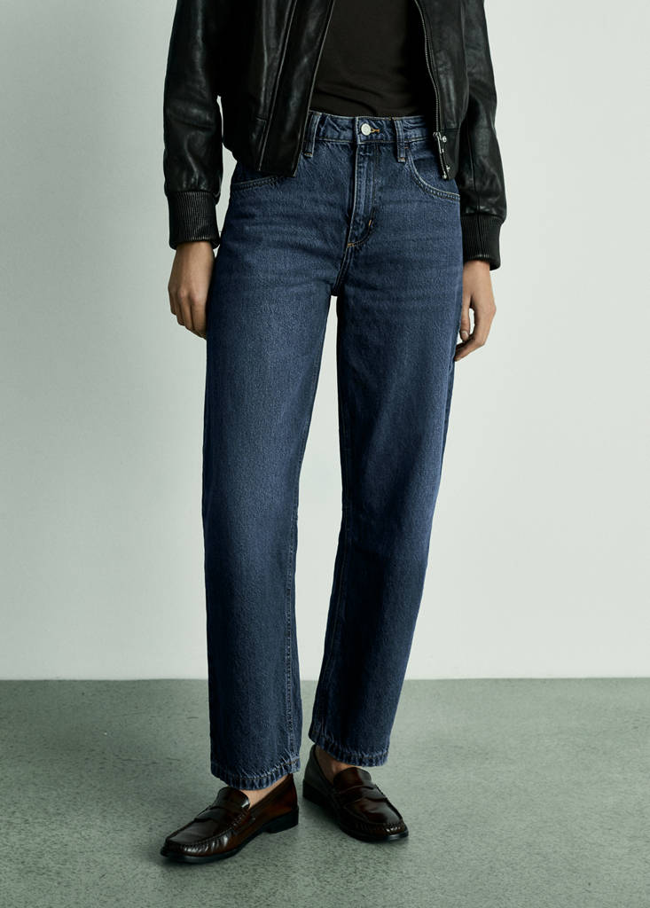 Denim-style cotton fabric. Slouchy fit. Long design. Balloon design. High-rise. Belt loops. Five pockets. Zip and button closure. Inside length 29.5 in