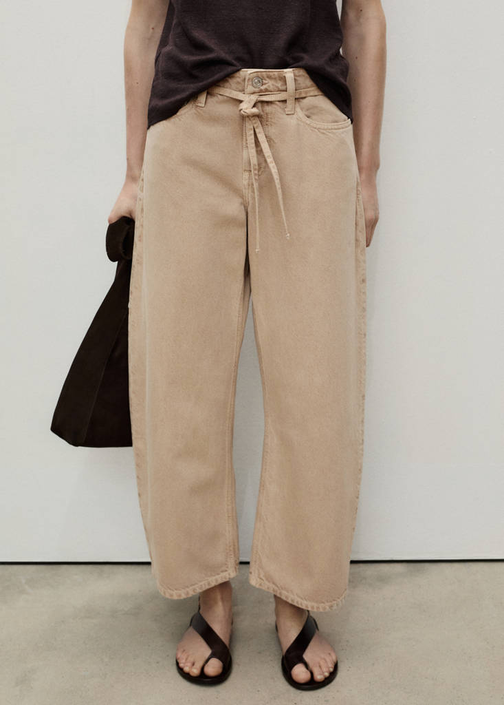 Denim-style cotton fabric. Long design. Balloon design. Crop design. Mid-rise. Belt loops. Removable belt. Five pockets. Front zipper and button closure