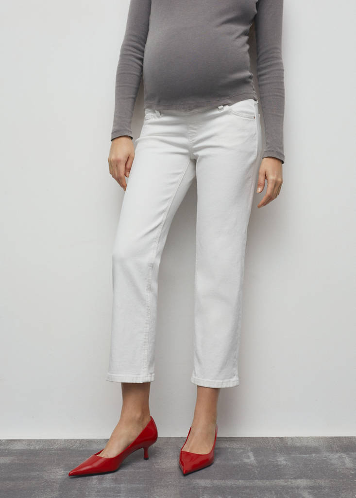 Denim-style cotton fabric. Straight design. Crop design. Low waist. Belt loops. Five pockets. Elastic waistband. Soft elastic at front side waistband for added comfort and support the growing bump. No closure. Decorative button. Inseam 25.98 in. We recommend you buy your usual size. Provides comfort and freedom of movement. Maternity