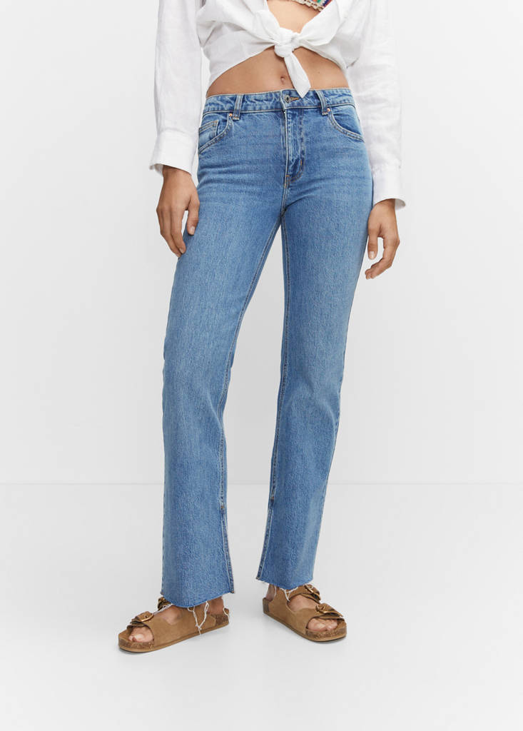 Denim style cotton fabric. Elastic. Straight design. Long design. Medium waist. Two side pockets. Two patch pockets on the back. Zip and one button fastening. Frayed hem. Hem slits. Inseam 31.49 in