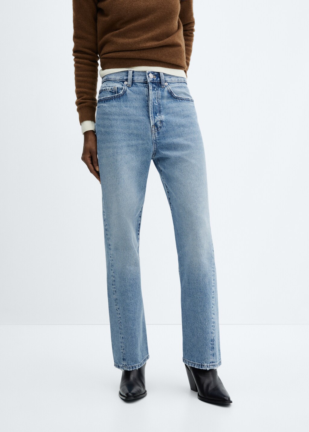 Cotton denim fabric. Straight design. High-rise. Belt loops. Five pockets. Button closure. Front seams. Interior length 72.5 cm. Available in Plus sizes.
