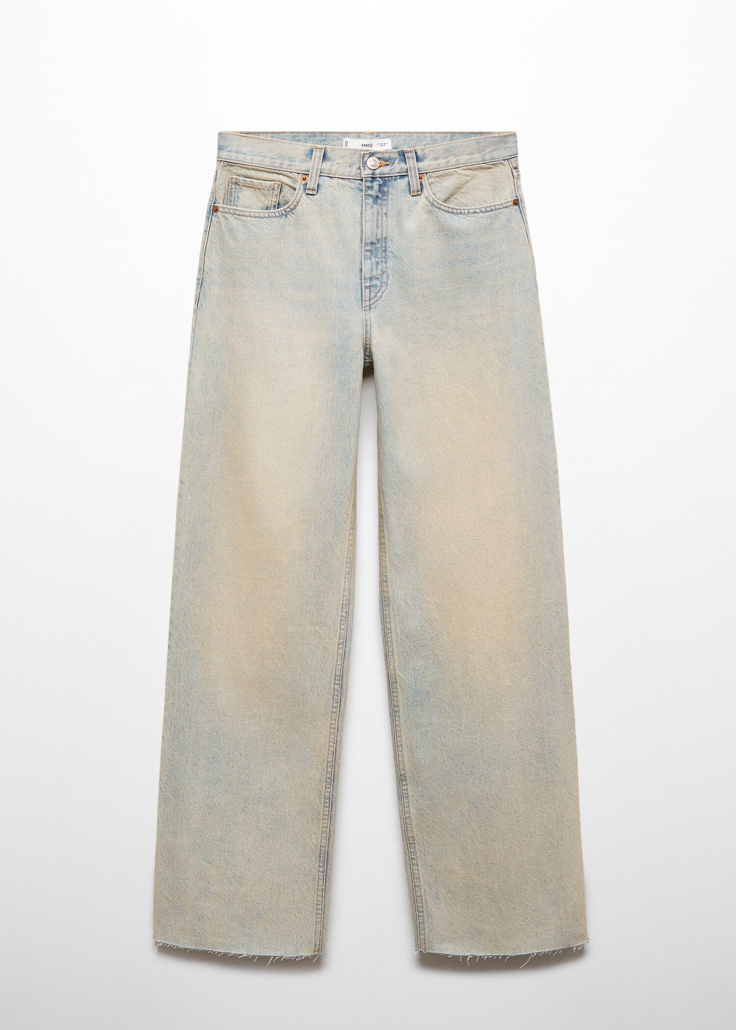 Denim-style cotton fabric. Long design. Wide-leg design. High-rise. Belt loops. Five pockets. Zip and button closure. Frayed hem. Interior length 85,8 cm.