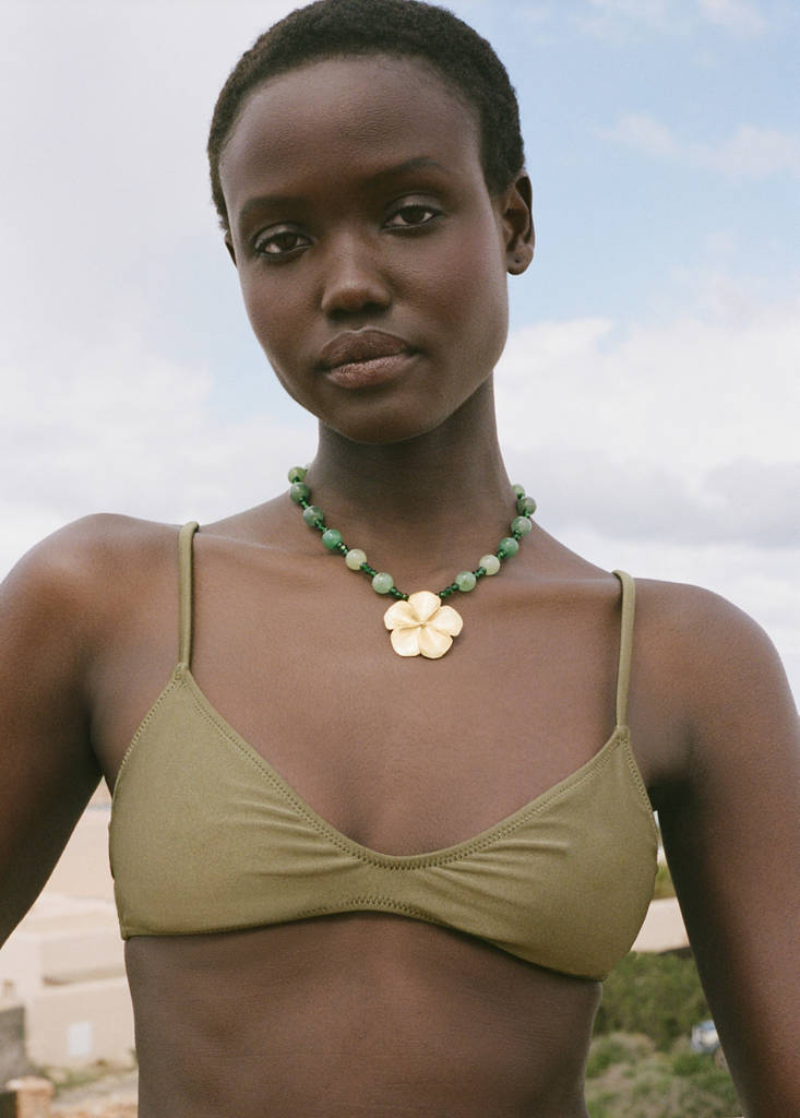Ball design. Combined design. Flower detail. Semi-precious stone appliqué. Chain and lobster clasp closure