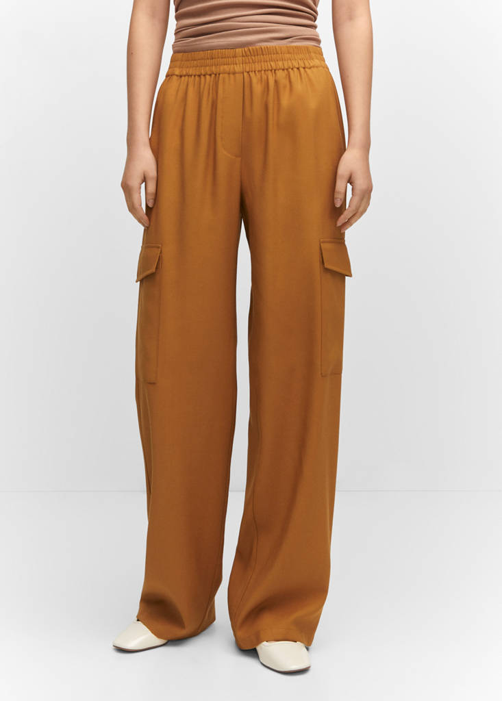 Fluid fabric. Cargo design. Long design. Two cargo pockets. Elastic waistband. No closure. Office looks