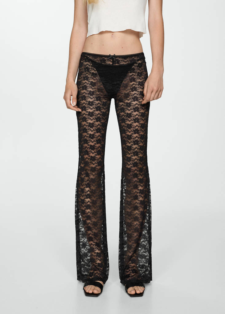 Lace fabric. Semi-transparent fabric. Straight design. Floral Design. Elastic waistband. Decorative bow. Embroidered finish. Total look