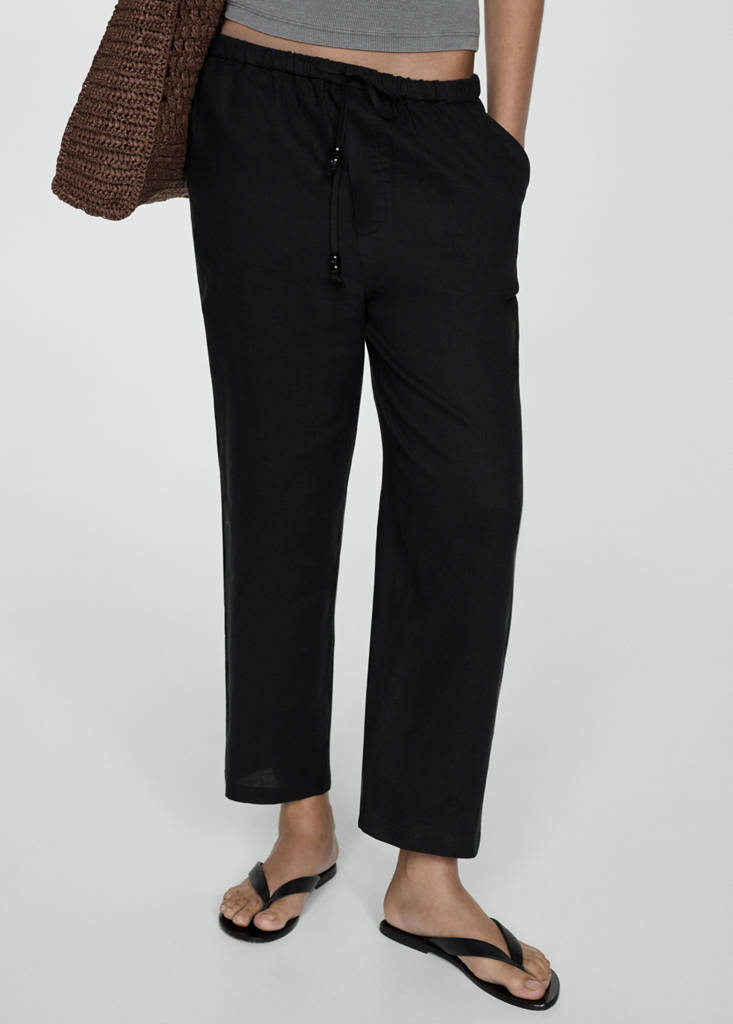 100% linen fabric. Jogger design. Long design. Elastic band. Two side pockets. Elastic waist with tie closure. Two welt pockets at the back. Inner lining. Available Plus. Linen fabric. Fluid fabric. Crop design. Mid-rise