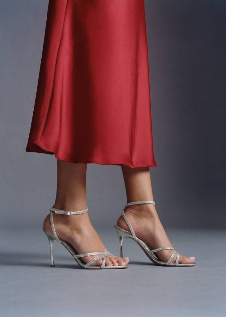 Metallic finish. Straps design. Stiletto heel. Ankle bracelet. Buckle closure. Rhinestone detail. 3.74 in heel. Knot detail. Party, ceremony, and communion collection. Embellished design