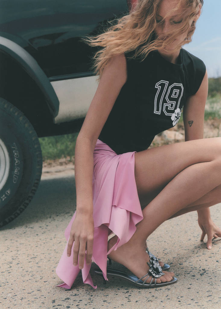 Straps design. Front opening. Round toe. Sling back. Kitten heel. 1.97 in heel. No closure. Flower detail