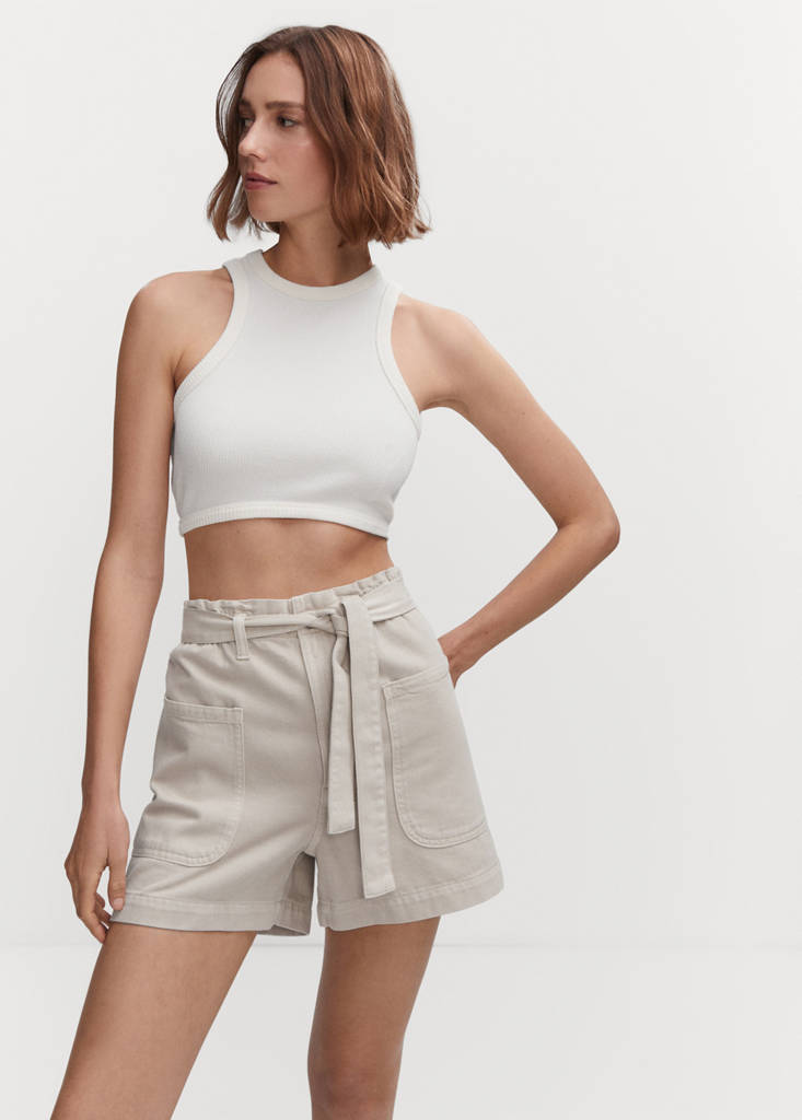 Denim-style cotton fabric. Paperbag. Short design. High-rise. Two patch pockets on the front. Two welt pockets at the back. Zip and button closure. Adjustable belt