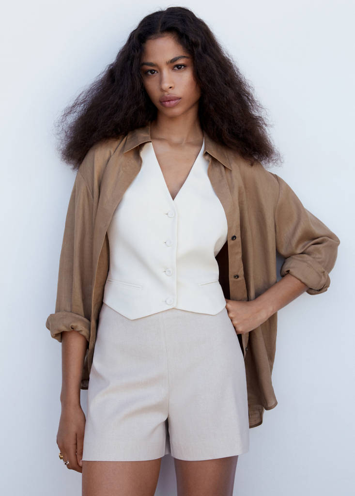 Linen and cotton blend fabric. Straight design. Short design. High-rise. Side zip fastening. Available Plus