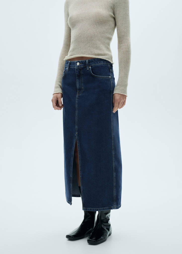 Denim-style cotton fabric. Midi design. Straight design. Belt loops. Five pockets. Zip and button closure. Opening in the lower front