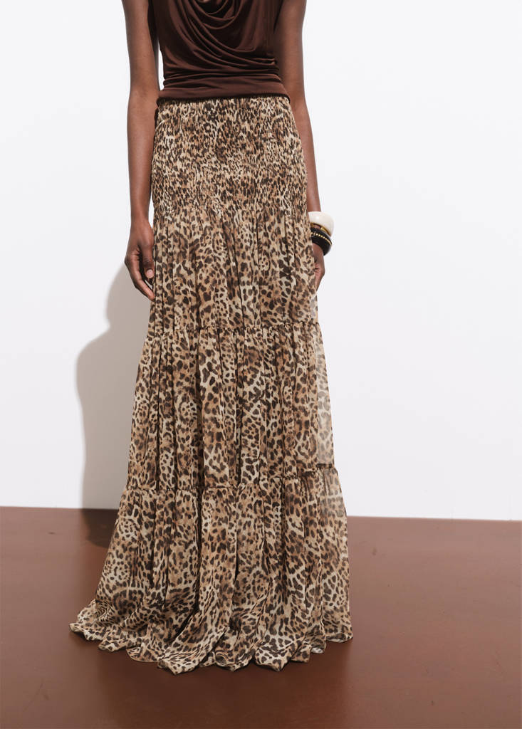 Maxi-length design. Straight design. Leopard print. Mid-rise. Ruched waist panel. Back zipper closure. Total look