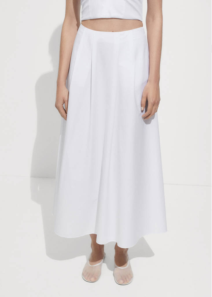 Cotton and lyocell blend fabric. Mid-rise. A-line design. Long design. Invisible back zip fastening