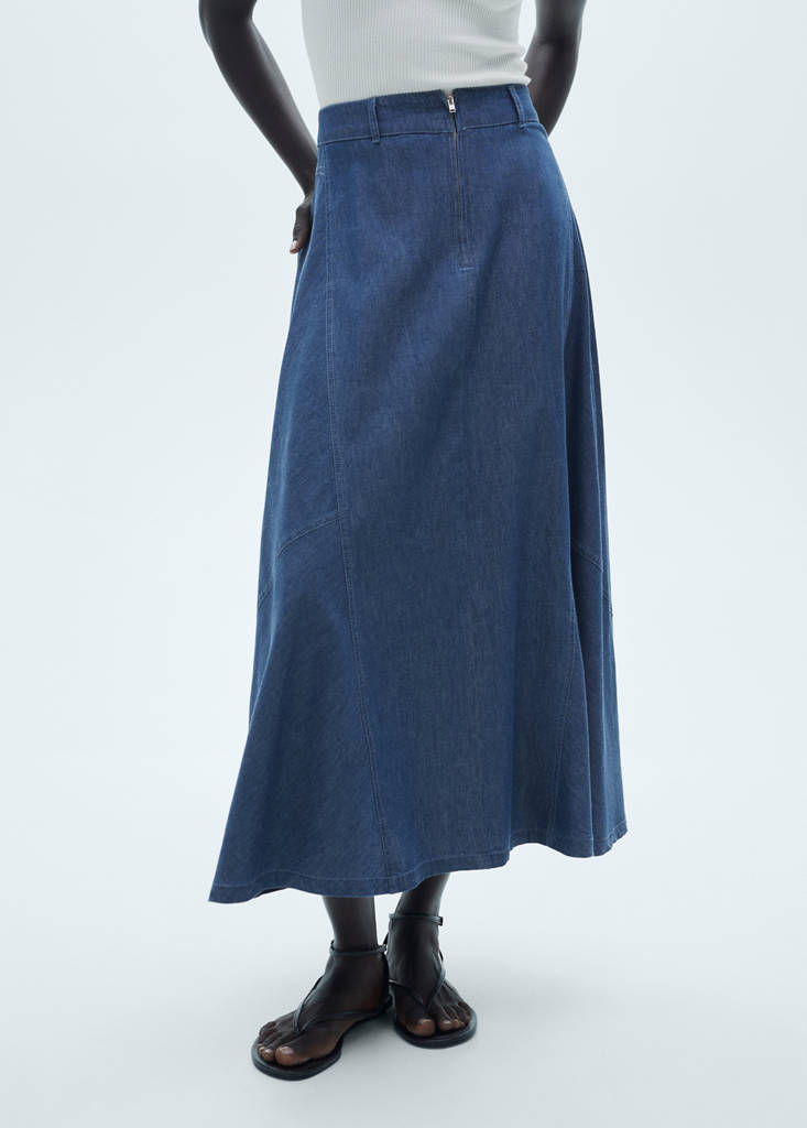 Long design. A-line design. Mid-rise. Zip fastening on the front section. Belt loops. Two patch pockets at the back. Denim-style cotton fabric