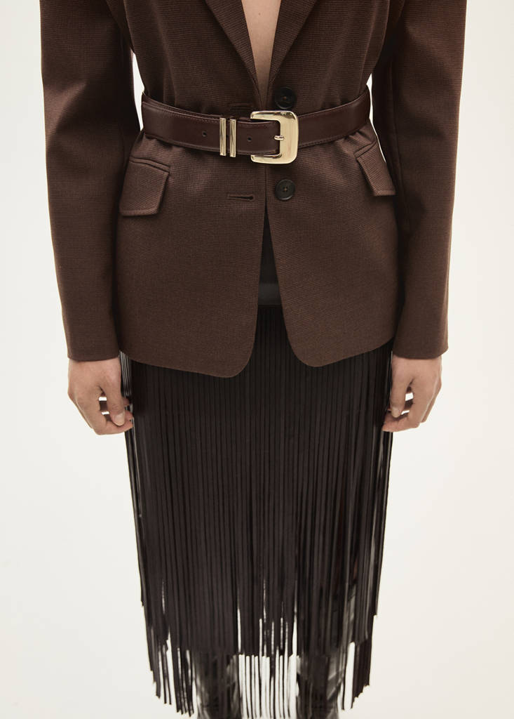 Leather effect. Straight design. Midi design. High-rise. Back zipper closure. Fringe finish