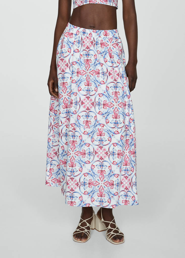 A-line design. Midi design. Two side pockets. Elastic waistband. No closure. Total look. Printed design. 100% cotton fabric
