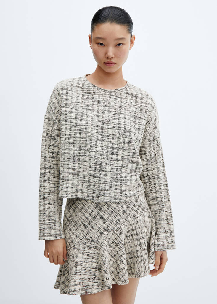Cotton blend fabric. Tweed fabric. Short design. Asymmetric design. Speckled print. Elastic waistband. No closure. Frill on the bottom. Total look