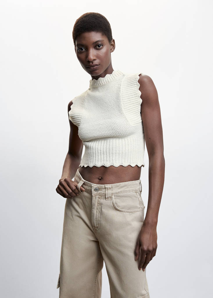 Cotton-blend fabric. Knitted fabric. Straight design. Rounded neck. Sleeveless. Open back. Scalloped edges. Unclosed. Festival Season