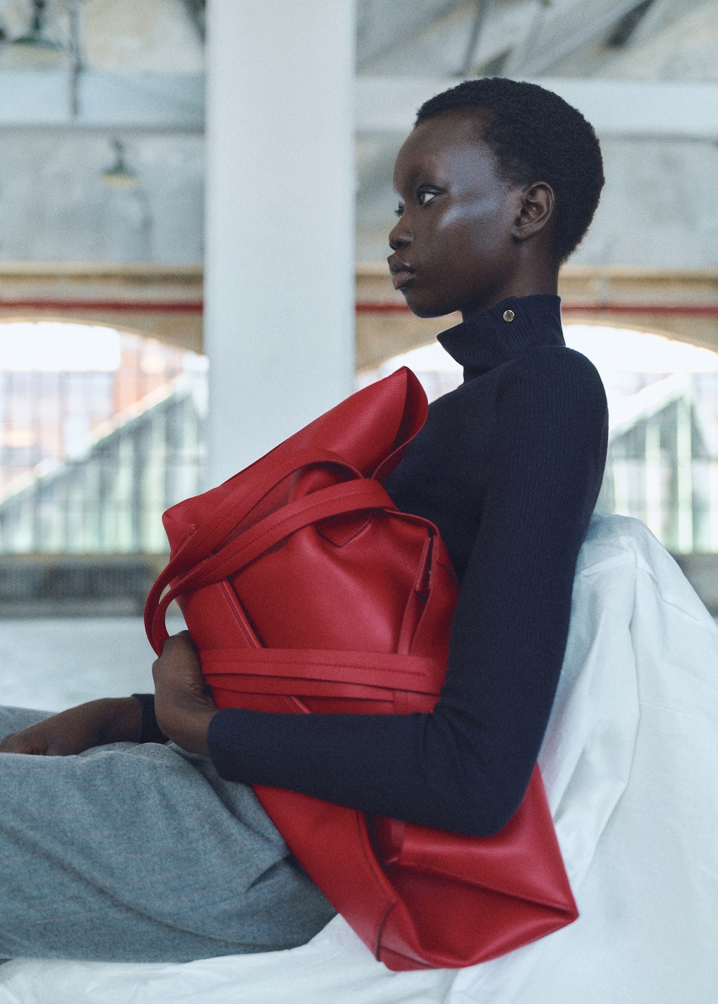 Cable knit fabric. Lightweight fabric. Slim fit. Standard design. Mock neck. Long sleeves. Button fastening on the shoulder. Metallic buttons.