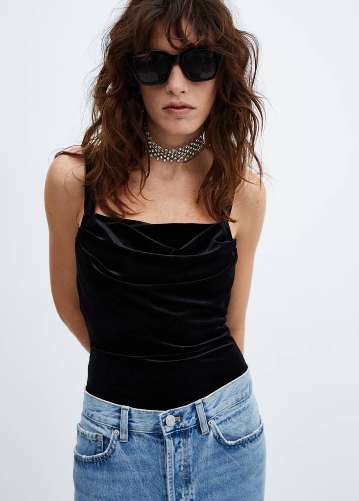 Velvet bodysuit with draped neckline