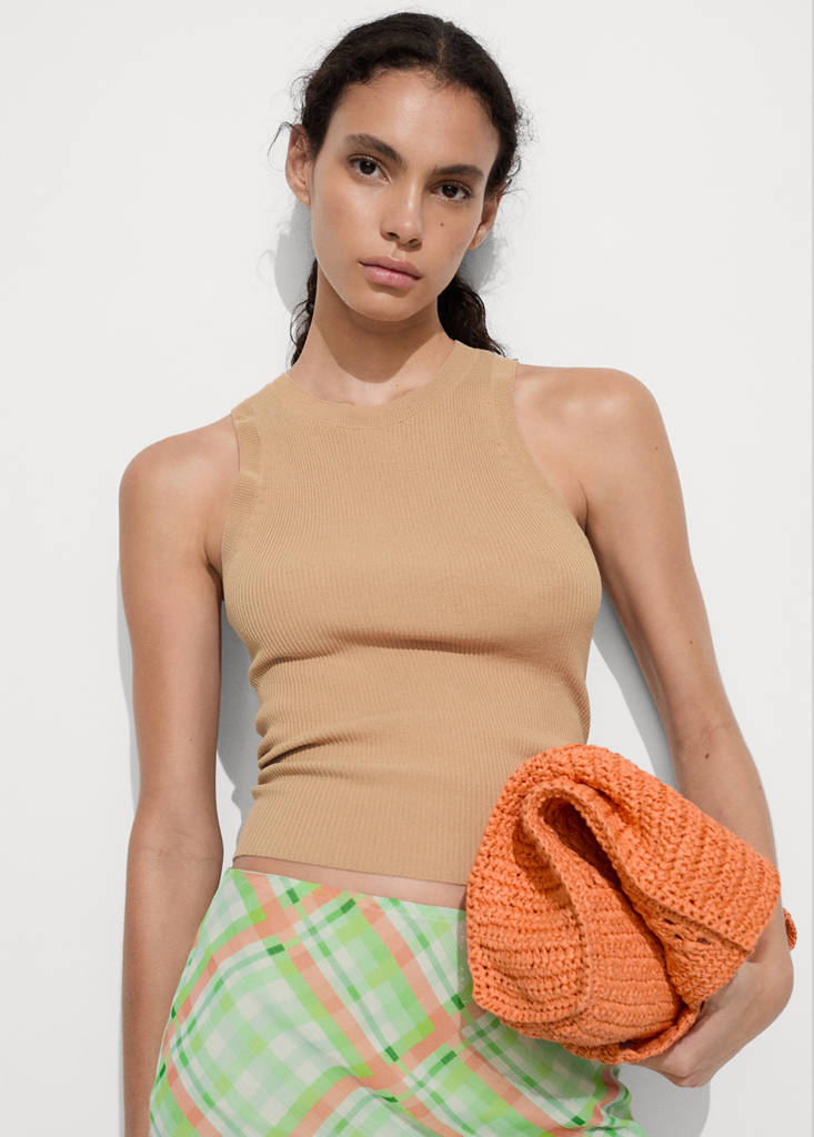 Ribbed knit topInitial price struck through [US$ 45.99 ]US$ 45.99Current price [US$ 31.99 ]US$ 31.99-30%Select a colourMedium BrownThe model is wearing size S and is 5'9" tall.Select your sizeXXSNot available. I want it!XSNot available. I want it!SNot available. I want it!MNot available. I want it!LNot available. I want it!XLNot available. I want it!XXLNot available. I want it!Notify meFine knit fabric. Cable knit fabric. Round neck. Wide straps. No closure. Available Plus. Office looks. Fitted design. Sleeveless. Straight designDetails, composition and careStore availability