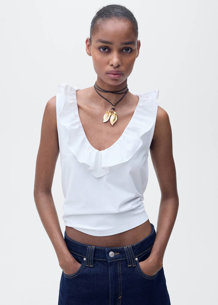 Cotton top with rufflesInitial price struck through [US$ 35.99 ]US$ 35.99Second price struck through [US$ 24.99 ]US$ 24.99Current price [US$ 19.99 ]US$ 19.99-44%Select a colourWhiteThe model is wearing size S and is 5'9" tall.Select your sizeXXSLast few items!XSSMLXLXXLNot available. I want it!AddCotton fabric. Straight design. V-neck. Sleeveless. Wide straps. Ruffles detail on the neck. No closureDetails, composition and careStore availability
