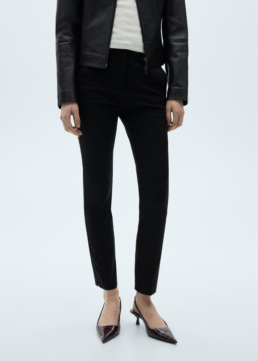 Crop design. Skinny fit. Mid-rise. Two side pockets. Two welt pockets at the back. Concealed button, hook and zip fastening. Inner lining. Fluid fabric. Cotton blend fabric. Side pockets. Long design. Zip and button closure. Two side welt pockets. Suit style. Stretch fabric. Button, hook and zipper front closure. Available in Plus sizes. Skinny pants with high elasticity and comfort. Sustainable. Office looks. Belt loops.