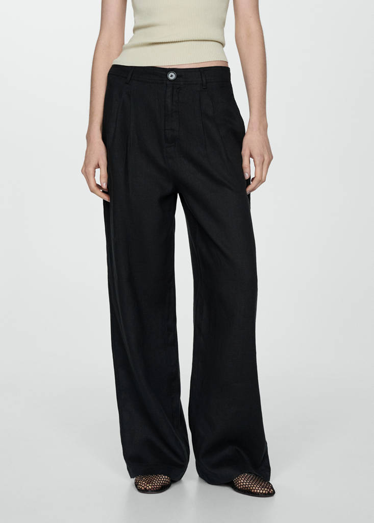 100% linen fabric. Wide-leg design. High-rise. Belt loops. Side pockets. Zip and button closure. Dart detail