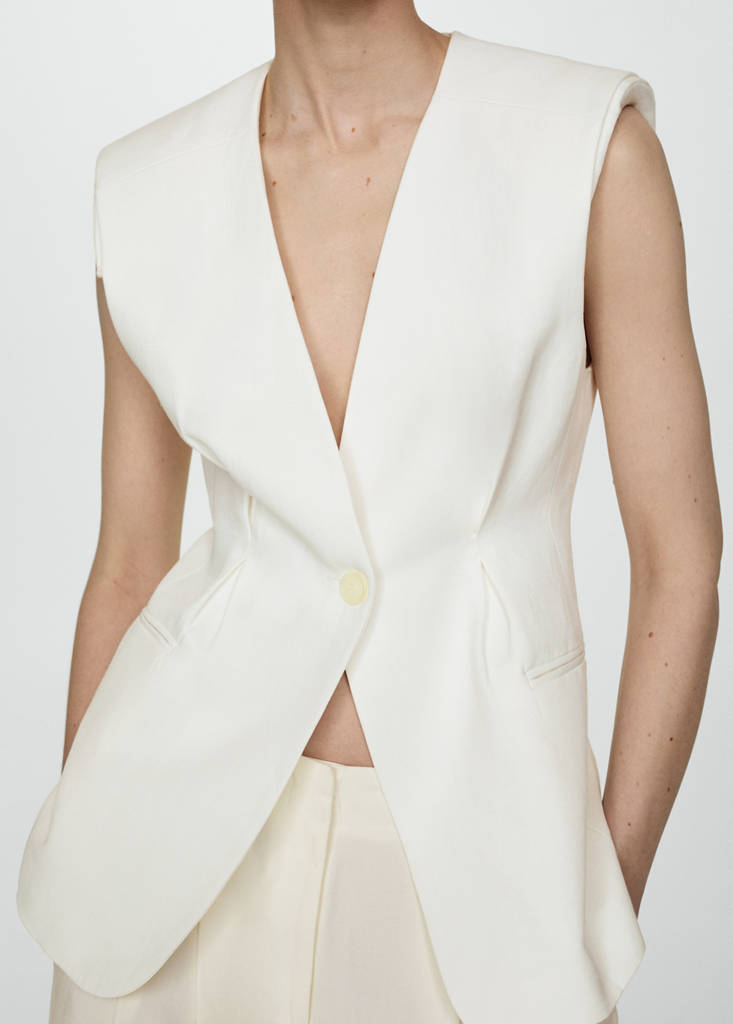 Cotton and linen blend fabric. Straight design. Long design. V-neckline. Sleeveless. Two front welt pockets. Front button closure. Inner lining. Party, ceremony, and communion collection. This garment is part of our event collection, designed to make you the perfect guest at any party, wedding, or ceremony.