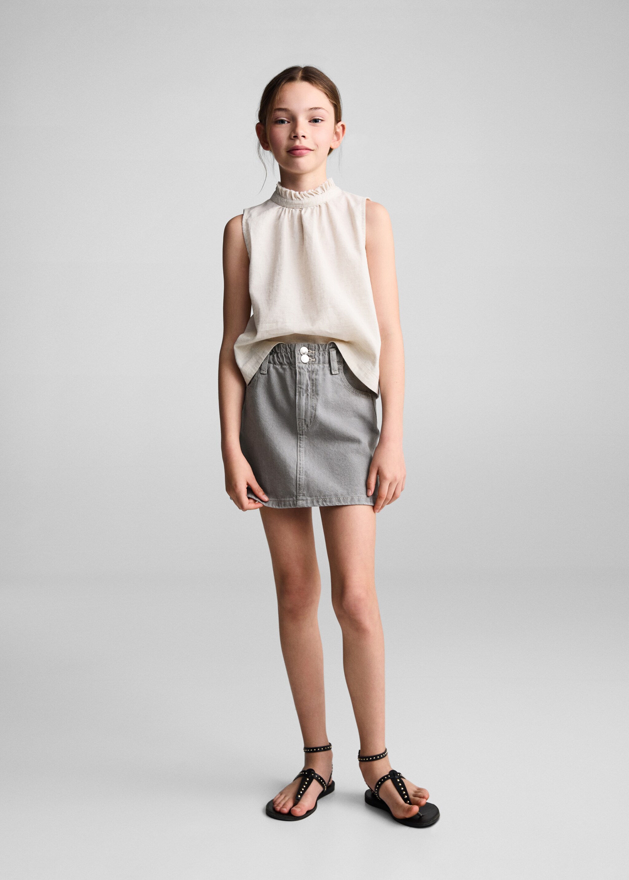 Las faldas de niña son una de las prendas más populares a la hora de vestir a las más pequeñas de la casa. Ideales para conseguir un look divertido y coqueto, las faldas de niña que encontrarás en Mango Outlet funcionarán en cualquier ocasión. Tenemos la falda de niña perfecta sea cual sea la prenda que estás buscando, tanto si la quieres para vestir a tu hija entre semana como para una salida con sus amigos. Una falda vaquera de niña es la aliada perfecta para combinar con cualquier camiseta o jersey para ir al colegio o jugar en el parque sin perder libertad de movimiento. En caso de que quieras una prenda divertida y original para tu hija, te recomendamos echar un vistazo a nuestras faldas de tul para niñas, que podrás encontrar en distintos colores y longitudes. Puedes elegir entre una falda de tul de niña estampada o con purpurina si a tu hija le gustan las prendas divertidas o elegir una prenda de corte largo y en colores lisos para conseguir un look algo más formal. Para los meses más cálidos también tenemos una gran variedad de faldas cortas de niñas en distintos tipos de corte: con cintura elástica, con diseño en tablas, con lentejuelas o de volantes. En Mango Outlet tenemos la falda de niña ideal para tu hija, echa un vistazo a nuestro catálogo y elige tu opción favorita.