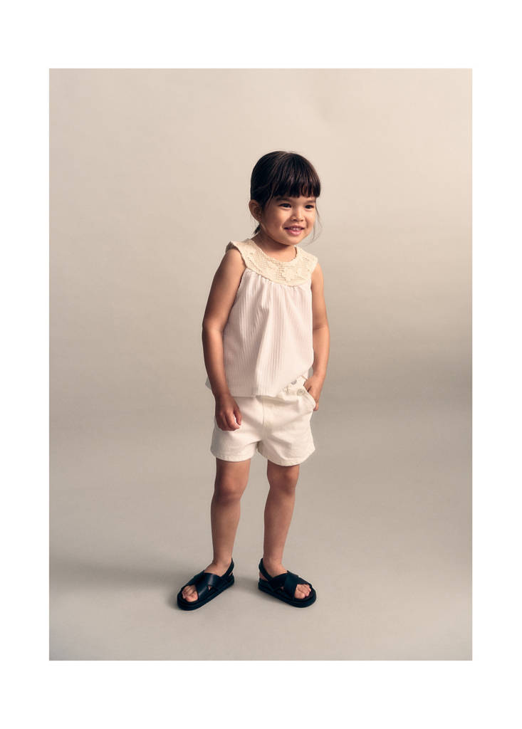 Tejido de algodón estilo tejano vaquero. Diseño recto. Diseño corto. Cintura con goma elástica. Botones decorativos. Paperbag. Dos bolsillos de parche en la parte posterior. Cierre de botones a presión. Summer camp