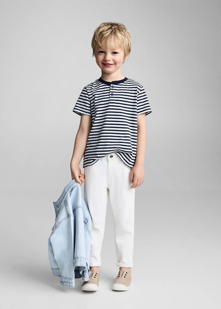 Tejido 100% algodón. Diseño estampado. Estampado de rayas. Diseño corto. Cuello redondo de canalé. Manga corta. Cierre delantero con botones