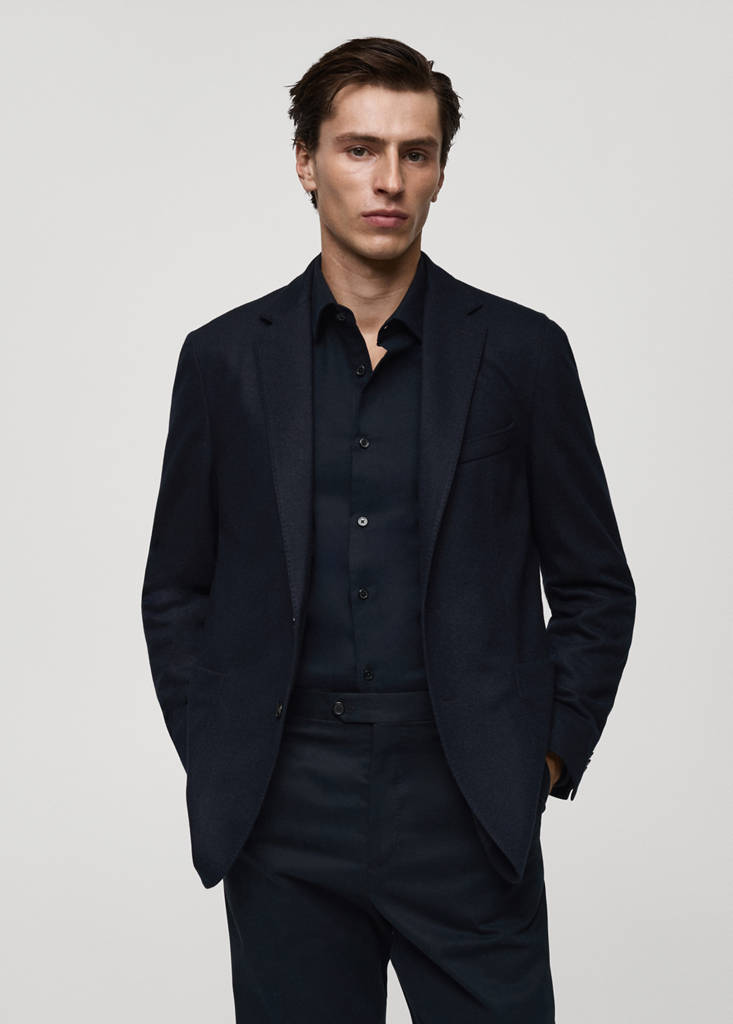 Cuello solapado con muesca. Cierre de doble botonadura. Un bolsillo de ribete en el pecho. Dos bolsillos de parche en la parte delantera. Manga larga con puños abotonados. Slim fit. Bolsillos interiores. Forro interior parcial. Colección Selection. Confeccionado en Portugal. Tejido franela mezcla de lana virgen. Doble abertura posterior en el bajo