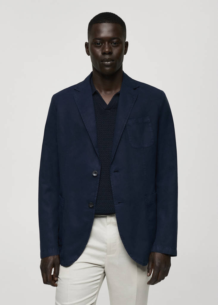 Slim fit. Tejido mezcla de algodón y lino. Tejido de lino delavé. Solapas de muesca y ojal. Bolsillo de parche en el pecho. Manga larga. Dos bolsillos de parche en la parte delantera. Bajo recto. Sin forro interior. 100ml. Cierre delantero con botones