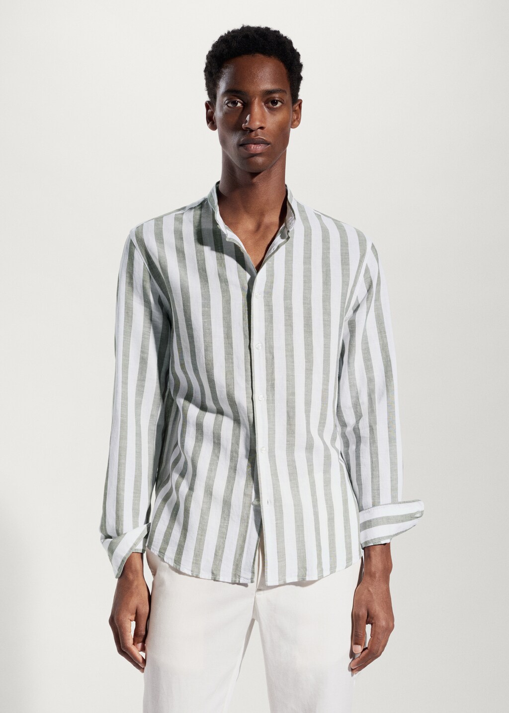 Tejido mezcla de algodón y lino. Tejido ligero. Regular fit. Cuello mao. Cierre de botones en la parte delantera. Manga larga con puños abotonados