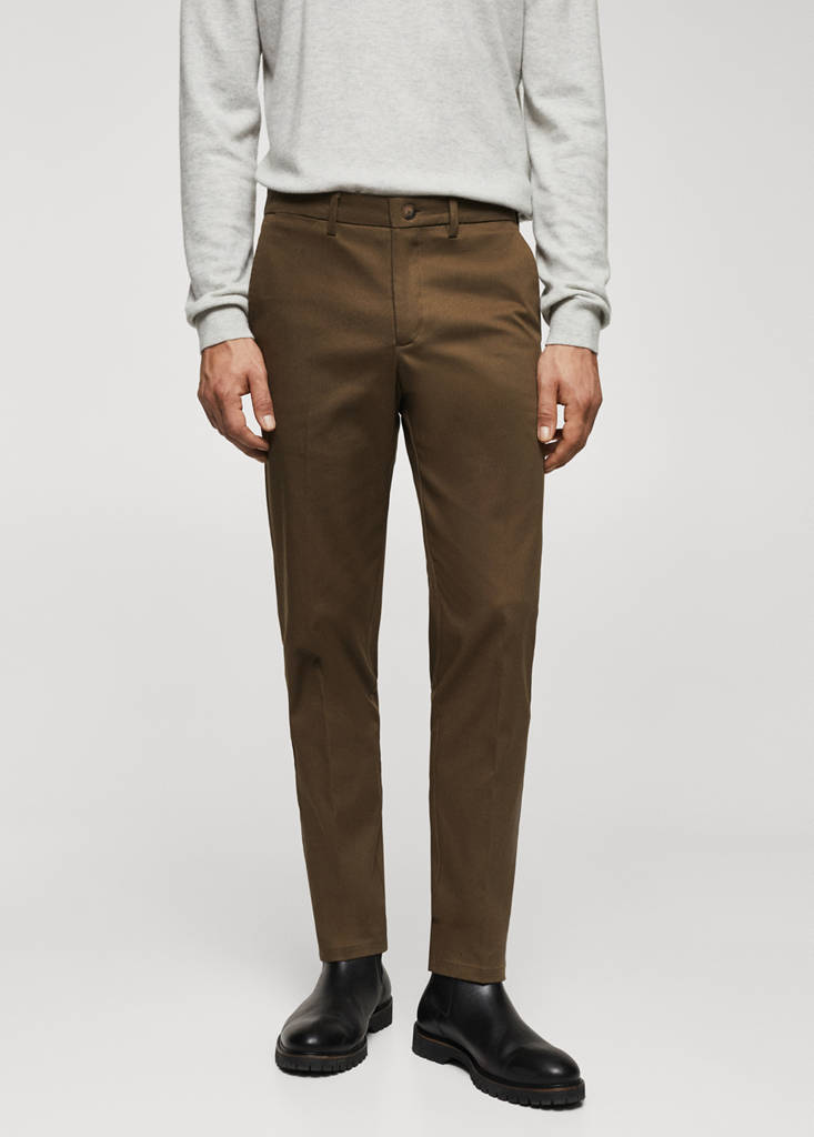 Tejido twill de algodón. Estilo chinos. Trabillas para cinturón. Cierre de cremallera y botones. Dos bolsillos laterales. Slim fit. Dos bolsillos de ribete en la parte posterior. Tallaje más ajustado de lo habitual. Se recomienda comprar una talla más grande. Diseño estándar. Bolsillo portamonedas a la altura de la cadera