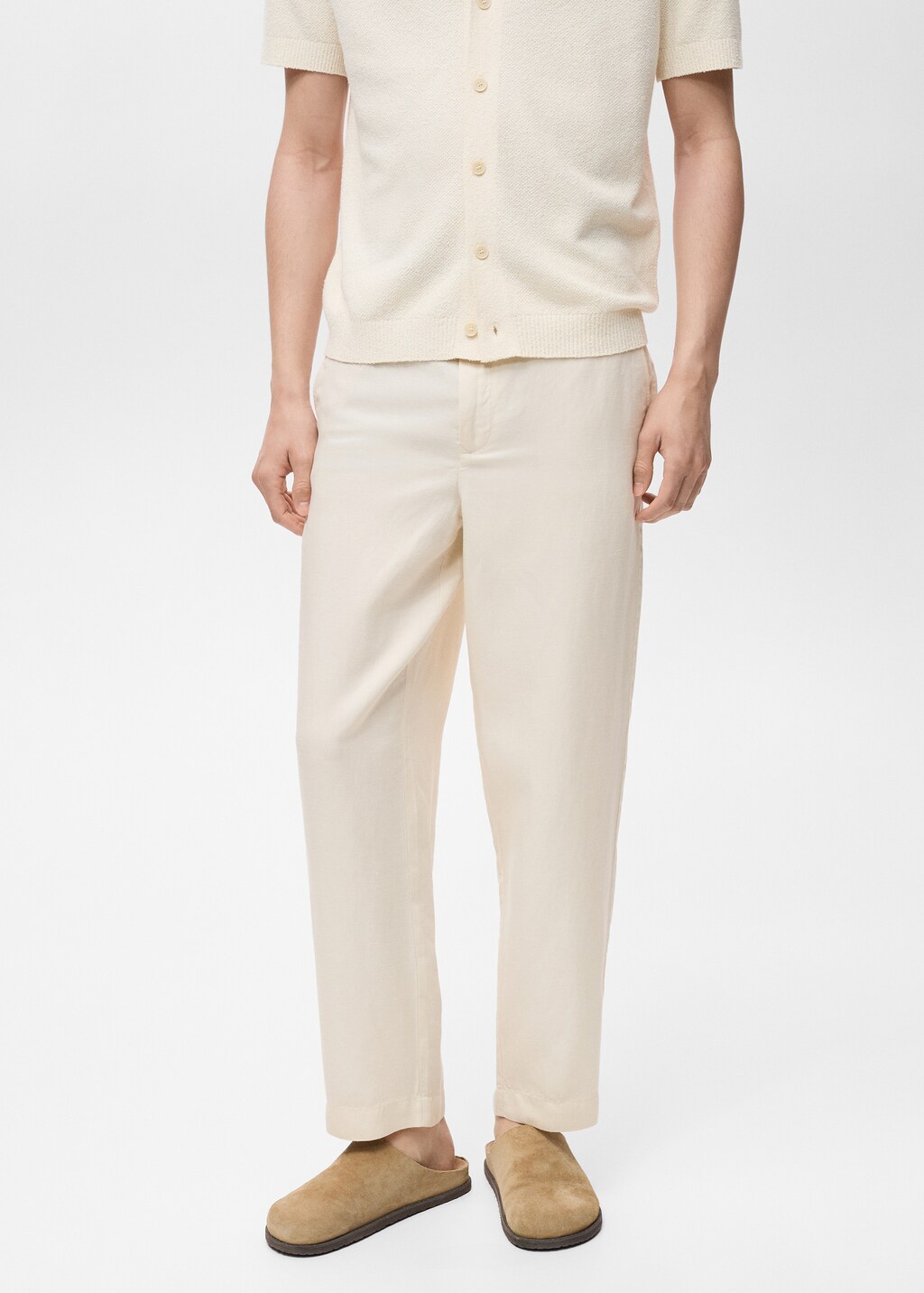Tejido mezcla de lino y lyocell. Straight fit. Trabillas para cinturón. Cintura con goma elástica. Cordón interior ajustable. Cierre doble botón y cremallera. Bolsillos laterales. Bolsillo de parche en la parte posterior.