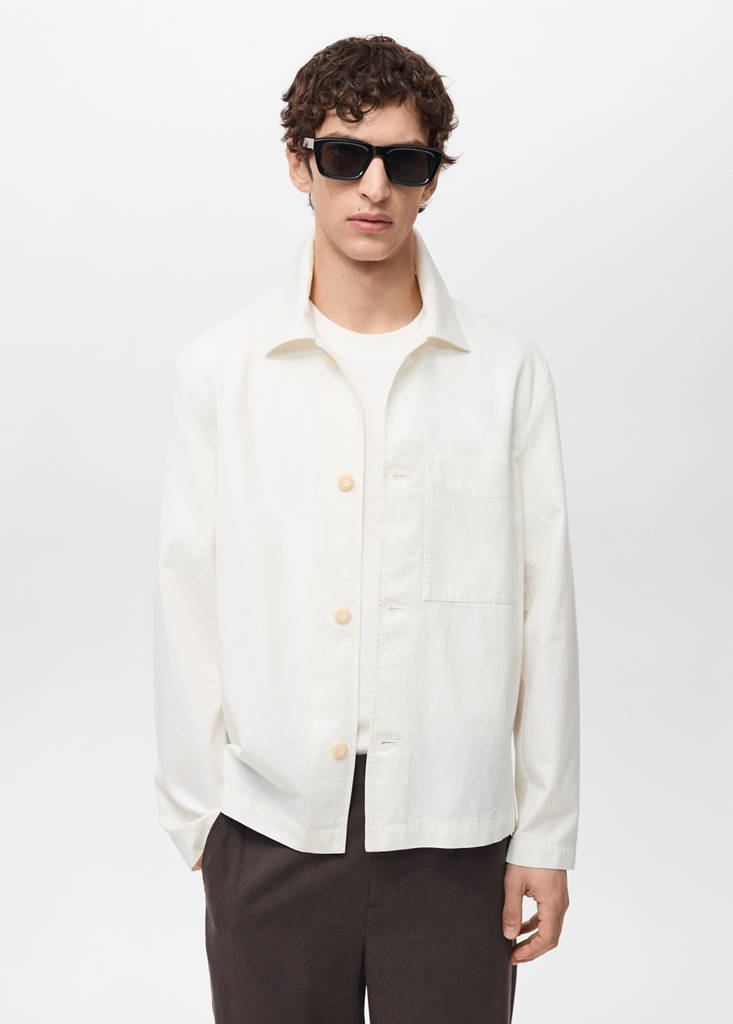 Straight fit. Tejido mezcla de lino y algodón. Cuello camisero. Cierre delantero con botones. Bolsillo de parche en el pecho. Puños abotonados. Bajo recto. Conjunto disponible como total look