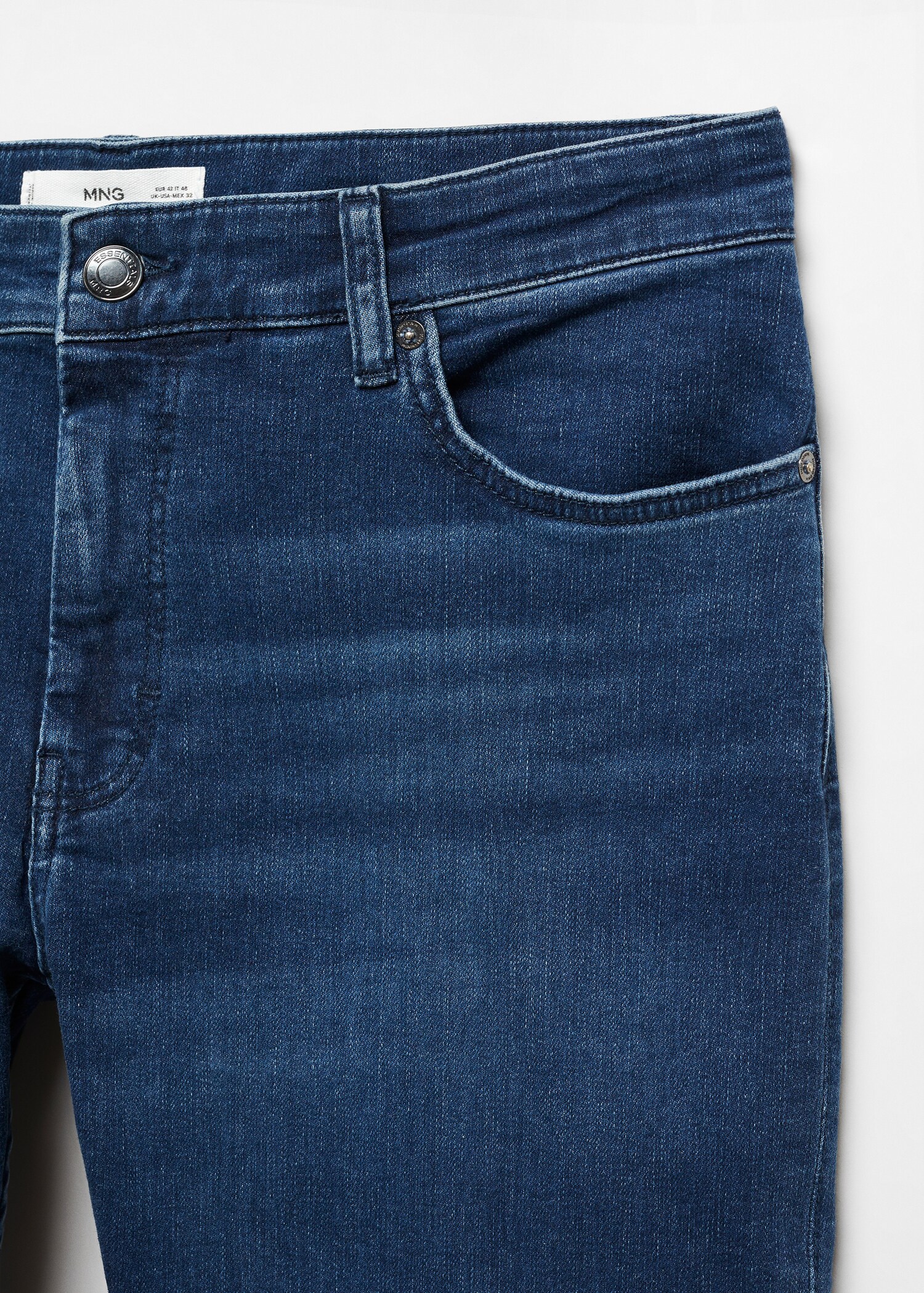 ESSENTIALS: Made to last. Slim fit. Tejido mezcla de algodón. Tiro medio. Color azul oscuro. Cierre de cremallera y botón. Trabillas para cinturón. Dos bolsillos laterales. Bolsillo portamonedas. Dos bolsillos de parche en la parte posterior. Estilo tejano vaquero.