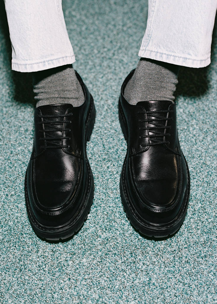 100% piel bovino. Estilo blucher. Cierre de cordones. Detalles pespunteados. Suela con volumen