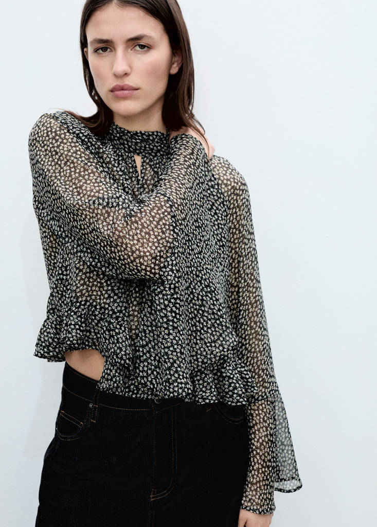 Tejido de gasa. Diseño semitransparente. Estampado de flores. Cuello alto. Abertura en el cuello. Manga larga con volante. Volantes en el bajo. Cierre de lazo en el cuello