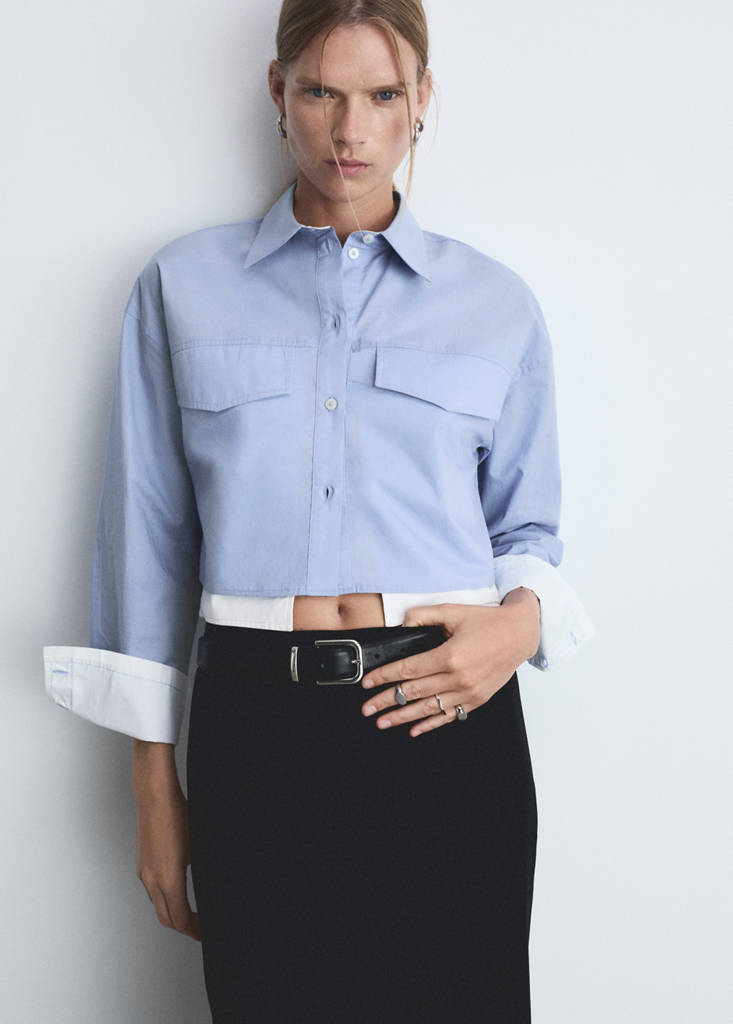 Tejido popelín de algodón. Diseño crop. Diseño recto. Diseño combinado. Cuello camisero. Manga larga con puños abotonados. Dos bolsillos de solapa en la parte delantera. Terminaciones en contraste. Tejido 100% algodón. Cierre delantero con botones