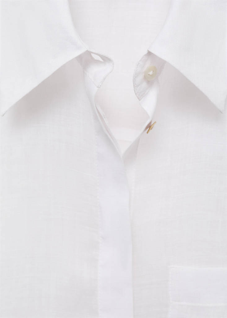 Tejido 100% ramio. Diseño recto. Regular fit. Cuello camisero. Manga larga con puños abotonados. Bolsillo de parche en el pecho. Cierre delantero con botones