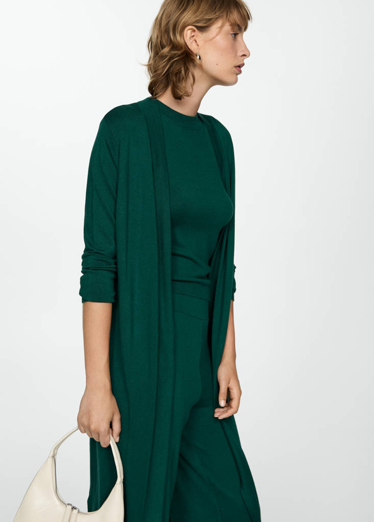 Cárdigan largo punto finoPrecio inicial tachado [US$ 69.99 ]US$ 69.99Segundo precio tachado [US$ 55.99 ]US$ 55.99Precio actual [US$ 12.99 ]US$ 12.99-81%Selecciona un colorVerde oscuroLa modelo lleva la talla S y mide 5'10".Selecciona tu tallaXSS¡Últimas unidades!MNo disponible ¡Lo quiero!LNo disponible ¡Lo quiero!XLNo disponible ¡Lo quiero!MedidasAñadirTejido de punto fino. Diseño recto. Diseño largo. Cuello pico. Manga larga. Sin cierreDetalles, composición y cuidadosDisponibilidad en tienda