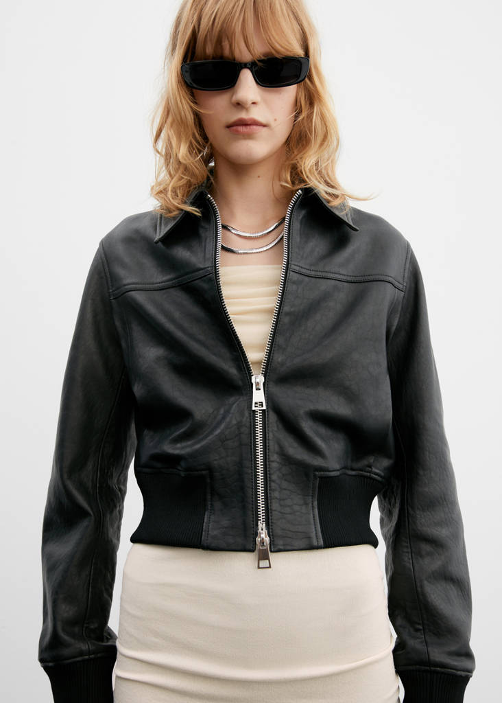 100% piel ovino. Diseño corto. Diseño bomber. Cuello camisero. Manga larga con puños elásticos. Dos bolsillos laterales. Cierre delantero con cremallera. Bajo con goma elástica. Forro interior. Colección Selection