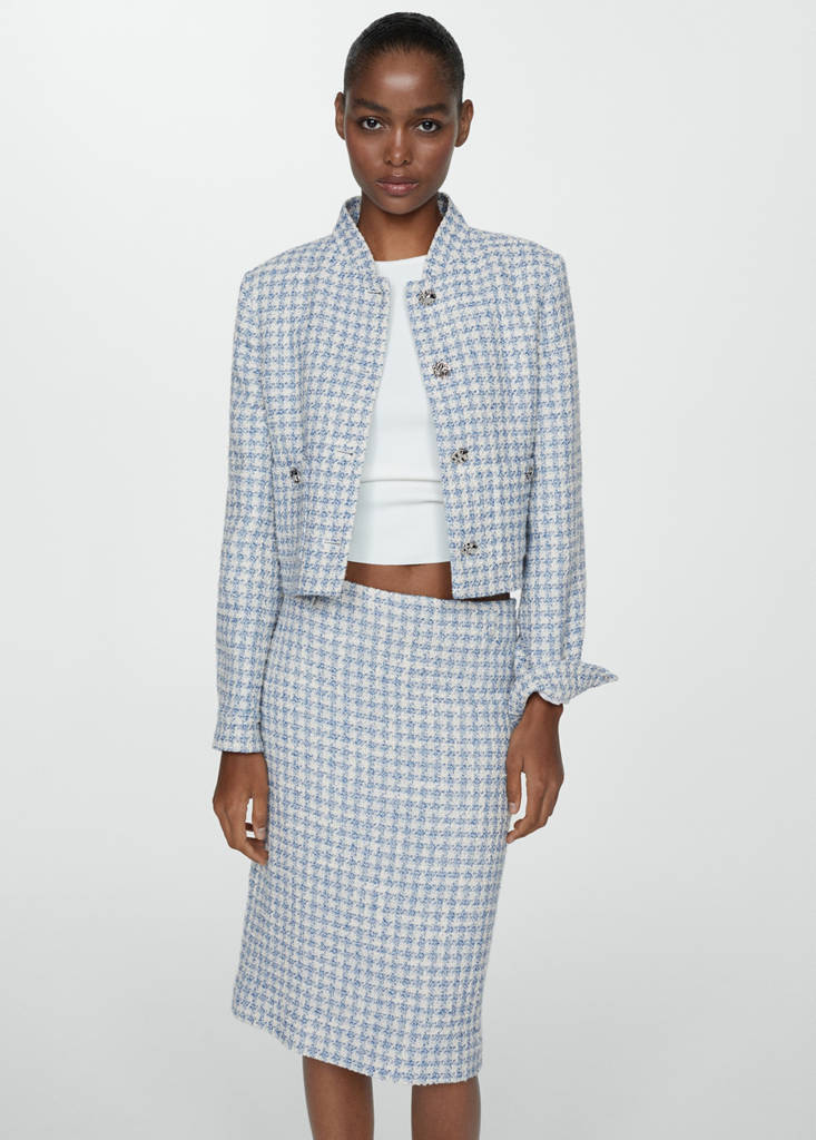 Tejido mezcla de algodón. Tejido tweed. Diseño corto. Diseño recto. Cuello redondo. Manga larga con puños abotonados. Dos bolsillos de parche con botón en la parte delantera. Cierre delantero de botones metálicos. Forro interior. Total look. Looks de oficina
