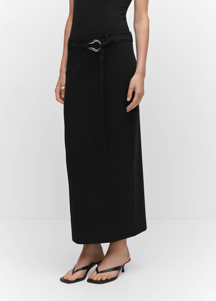 Tejido fluido. Diseño recto. Diseño largo. Tiro medio. Cierre de cremallera en la parte posterior. Cinturón desmontable. Costuras decorativas. Detalle de abertura en la parte posterior. Looks de oficina