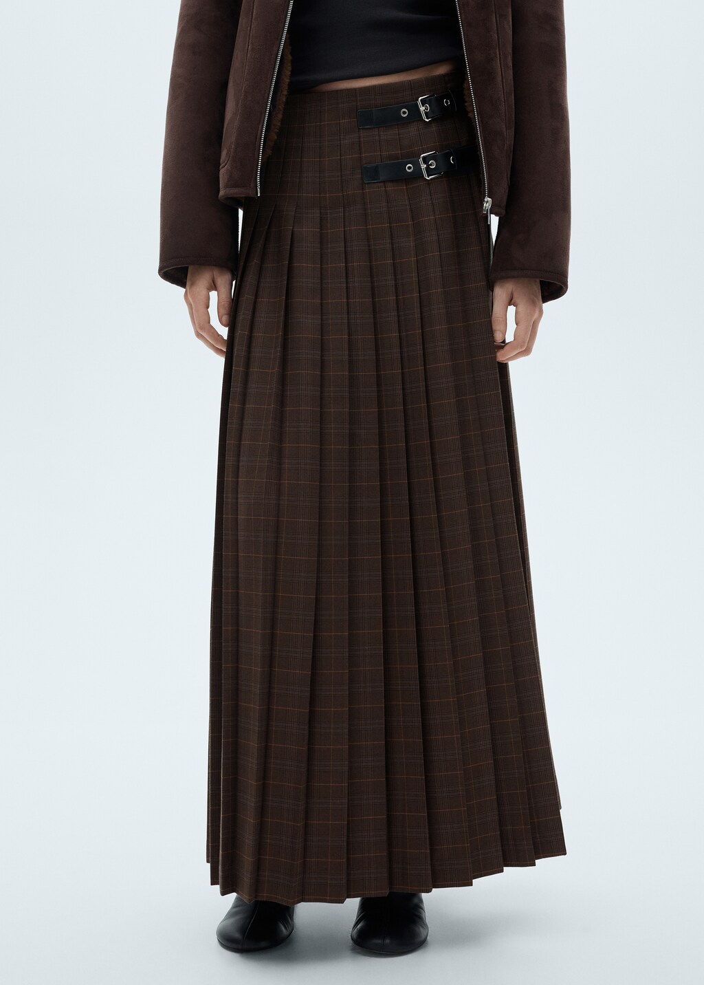 Diseño evasé. Diseño maxi. Diseño de tablas. Diseño de cuadros. Tiras laterales ajustables de hebilla. Cierre de cremallera lateral. Tejido fluido.