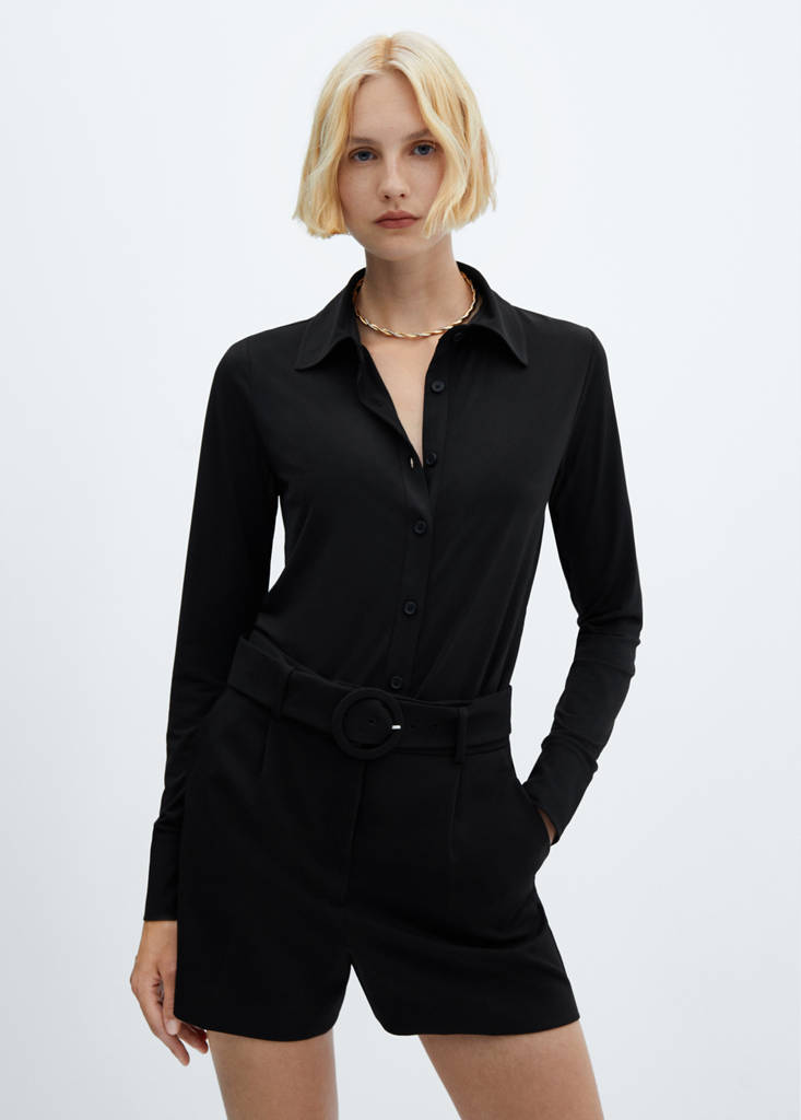 Tejido fluido. Corte paperbag. Diseño corto. Tiro alto. Trabillas. Bolsillos laterales. Cinturón desmontable. Cierre oculto de botón, gancho y cremallera. Detalle de pinzas. Looks de oficina