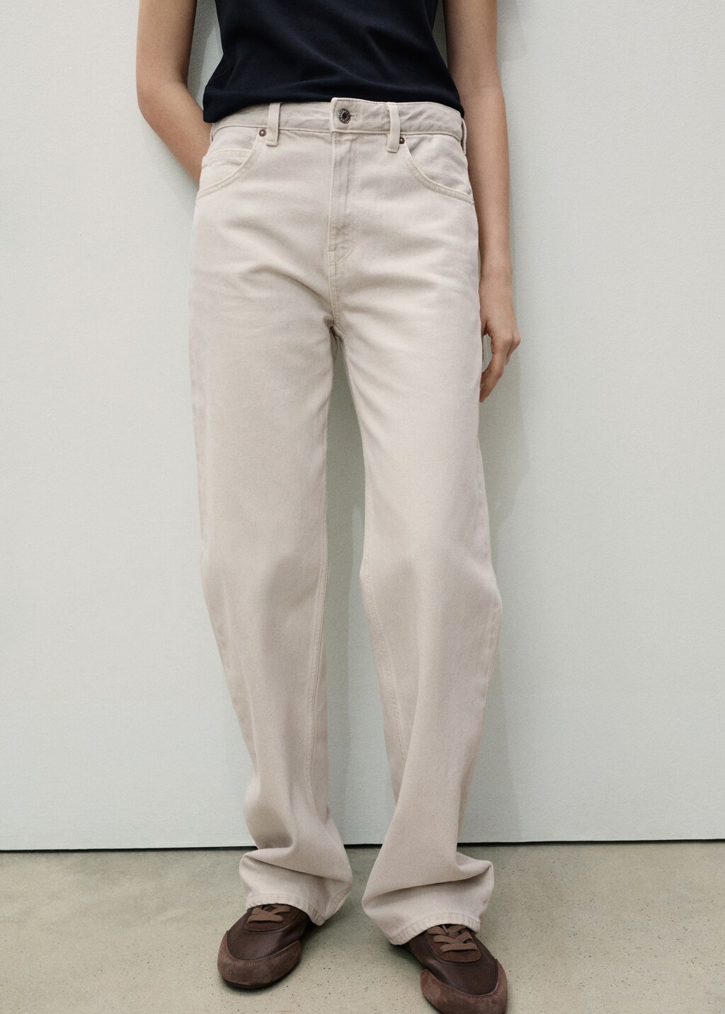 Tejido de algodón estilo tejano vaquero. Diseño largo. Diseño recto. Tiro medio. Trabillas. Cinco bolsillos. Cierre delantero de cremallera y botón. Largo interior 82 cm.